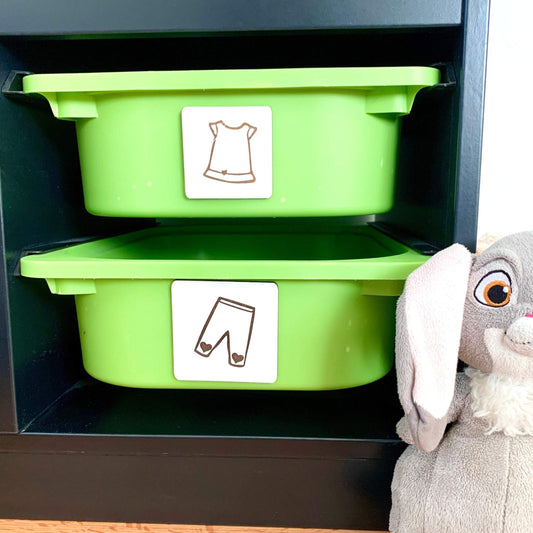 Toy storage bin organizing labels